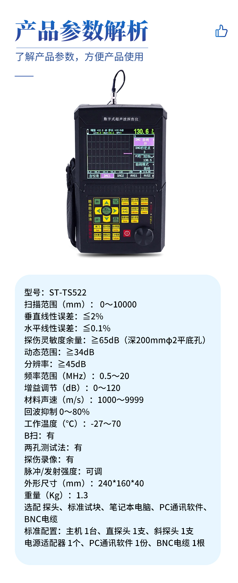 选配 | 探头、标准试块、笔记本电脑、PC通讯软件、BNC电缆 |