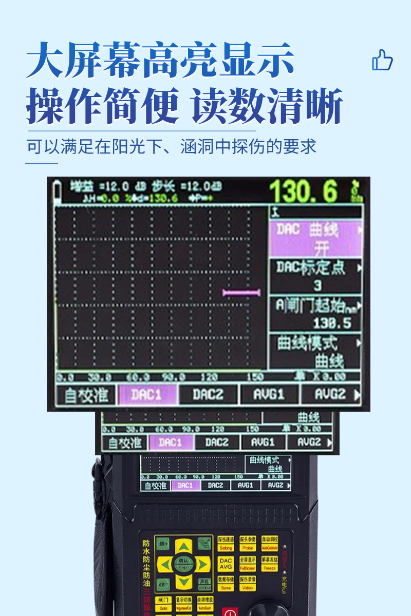 ● 大屏幕高亮显示,可以适合在阳光下、涵洞中探伤的要求;
