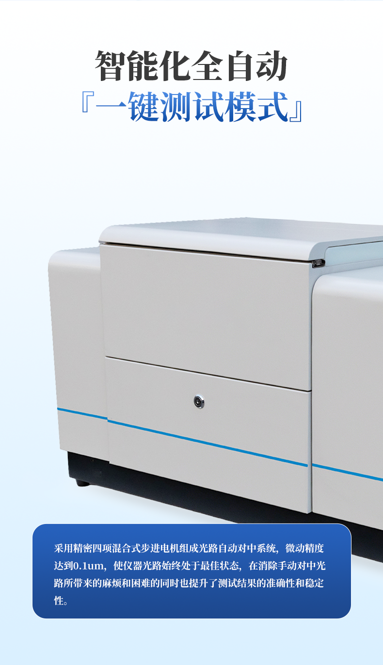 | 全自动对中系统 | 采用精密四项混合式步进电机组成光路自动对中系统,微动精度达到0.1um,使仪器光路始终处于**状态,在消除手动对中光路所带来的麻烦和困难的同时也提升了测试结果的准确性和稳定性。 |