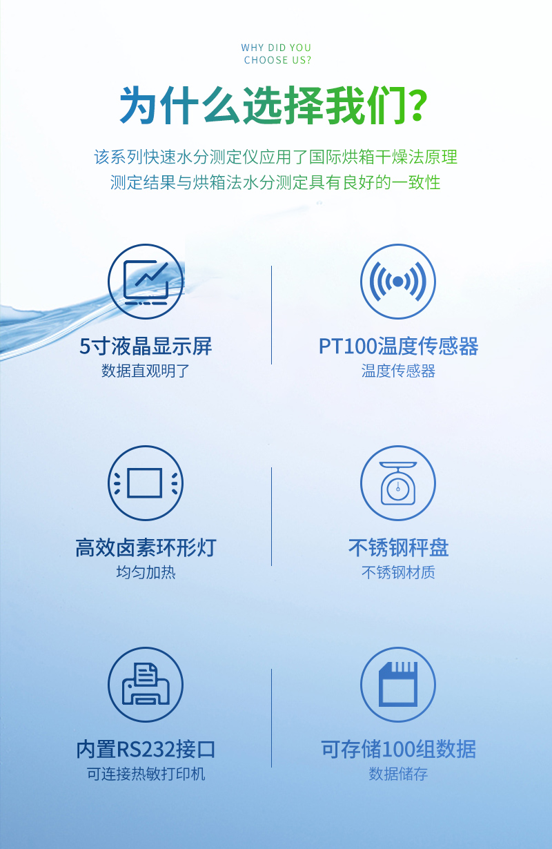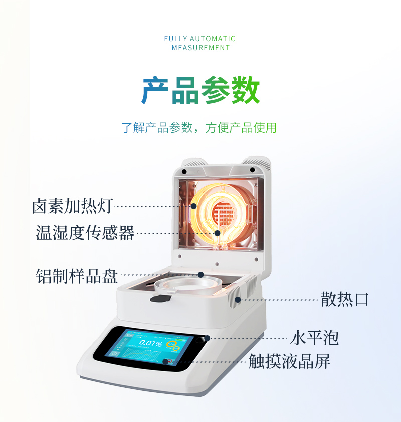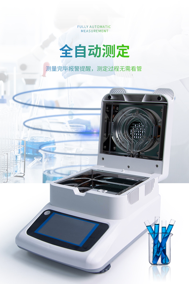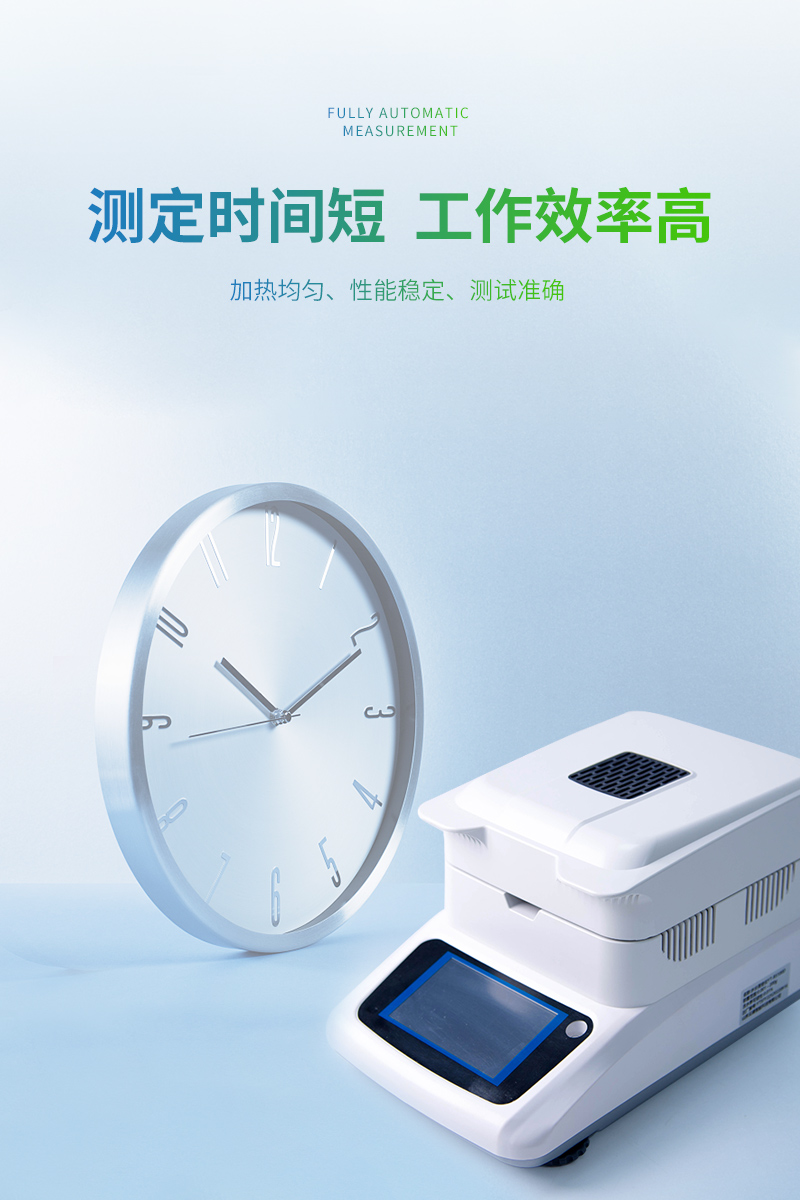 该系列快速水分测定仪应用了国际烘箱干燥法原理,测定结果与烘箱法水分测定具有良好的一致性,工作效率却远远高于烘箱法水分测定,一般样品只需要几分钟即可测量完毕,因此受到广大用户的青睐与好评。