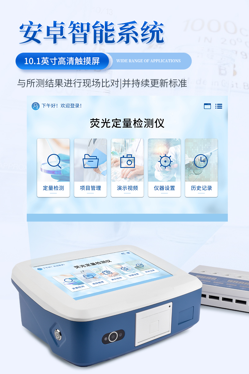 1、检测原理:荧光定量免疫层析法,对比检测区(T线)、质控区(C线)与背景区的荧光信号强度,依据检测卡内置的标准曲线计算靶标物的含量;