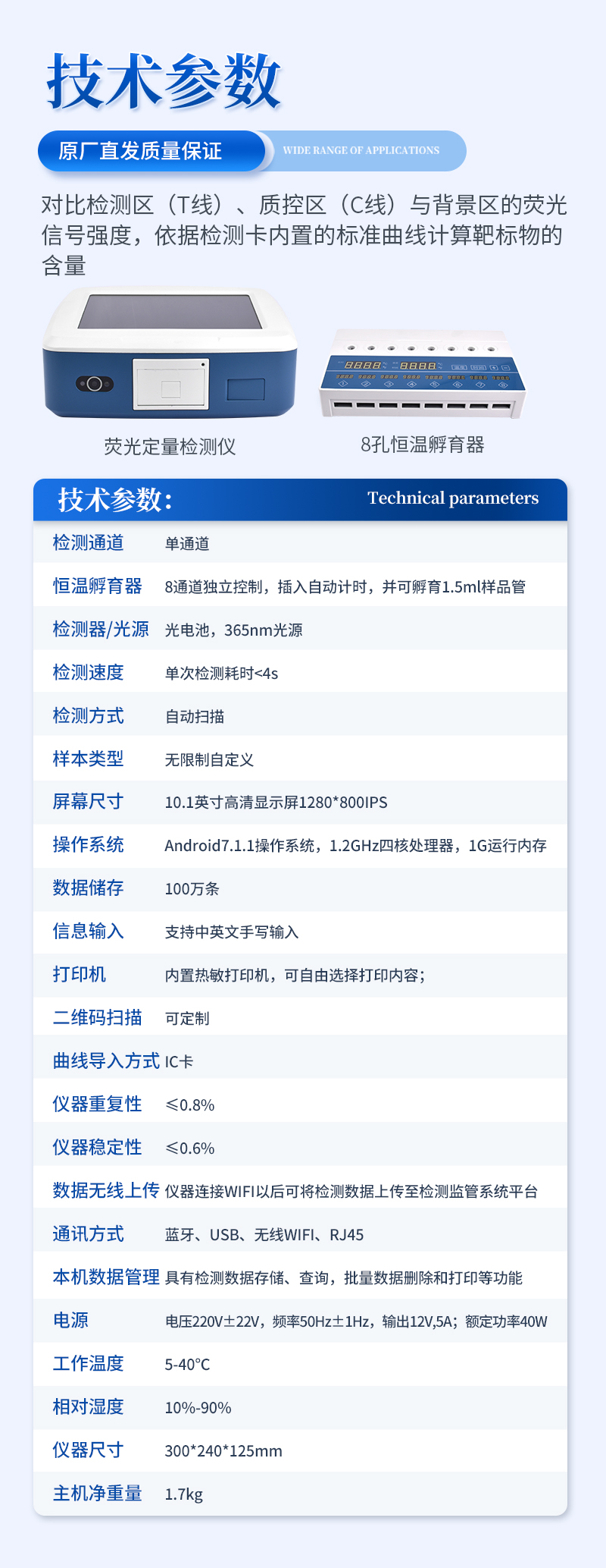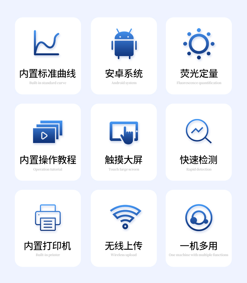 2、稳定性**:采用进口荧光微球,颗粒均一,从源头保证产品稳定性好,批次内、批次间重现性好;配备8孔恒温孵育器,一条一孔,自动计时,蜂鸣提醒,不受外界温湿度影响,适用场地更广;