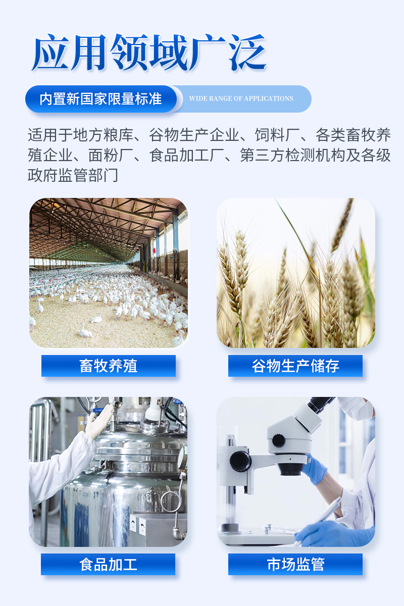 荧光定量真菌毒素快速检测仪采用荧光定量快速检测原理,主要检测粮油谷物饲料中真菌毒素含量,包括黄曲霉毒素B1、黄曲霉毒素M1、玉米赤霉烯酮、呕吐毒素、伏马毒素等等,检测样品涵盖粮食谷物(大米、玉米、小麦、大麦、高粱等)及其制品、饲料及其原料、食用油脂、牛奶及其制品等;样品前处理简单,整个检测过程检测12min,产品适用于地方粮库、谷物生产企业、饲料厂、各类畜牧养殖企业、面粉厂、食品加工厂、第三方检测机构及各级政府监管部门;