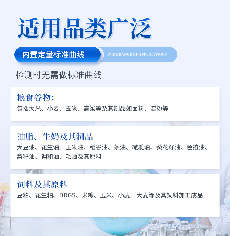 4、内置定量标准曲线:仪器内置标准曲线,无需使用标准品,检测时无需做标准曲线,既节省了成本,也避免了操作人员与呕吐毒素的接触,保护操作人员的安全;