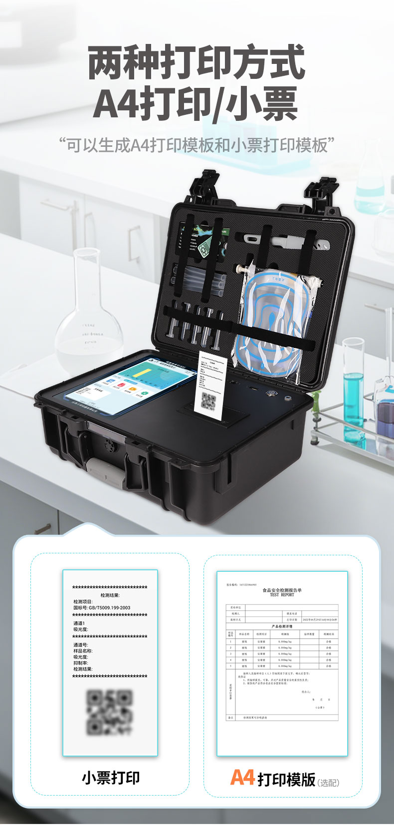 10、A4纸版本报告打印功能:设备拥有两种结果展示方式,可以自动生成A4打印模板和小票打印模板两种样式,可通过WiFi及网线等方式链接外置打印机可进行打印