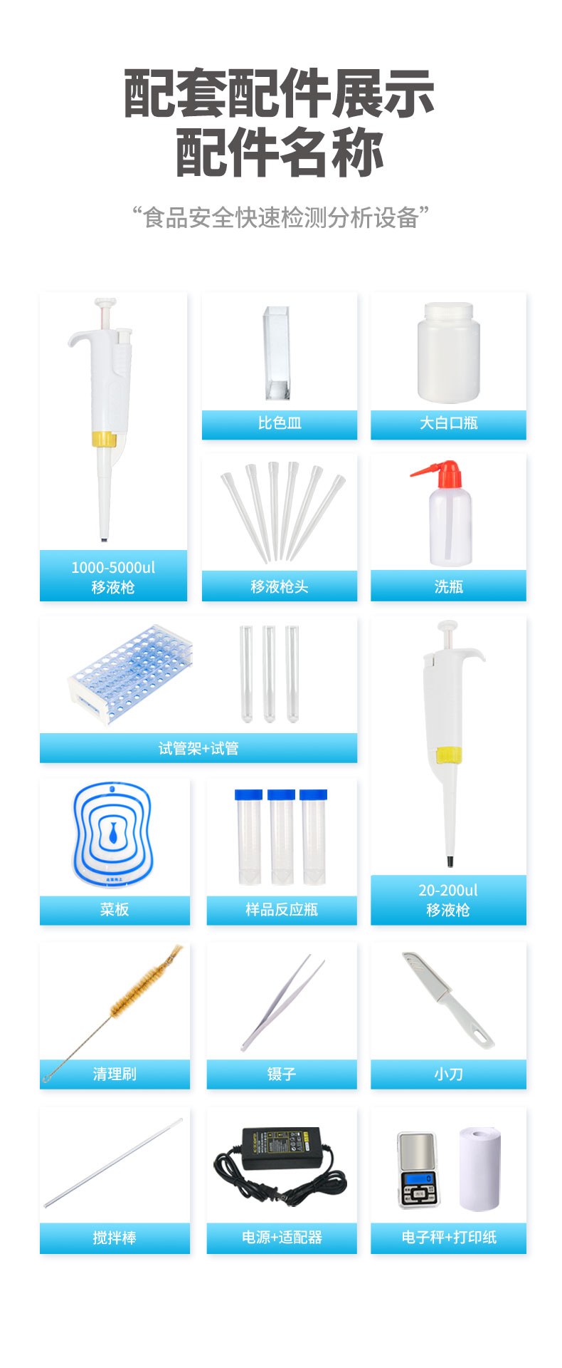 3、一体化便携式快检设备,采用交直流两用供电方式,可连接车载电源,配备6ah大容量充电锂电池,可以满足现场及流动检测使用的需求。仪器尺寸:43×35×20cm, 主机净重:5.1kg