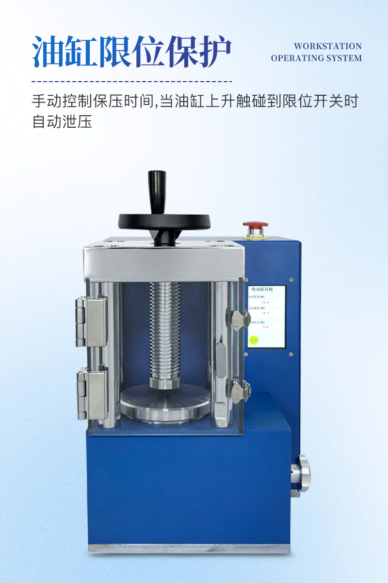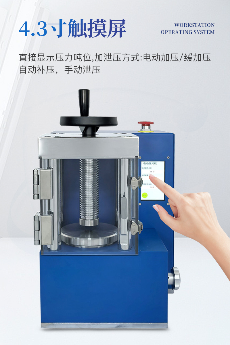 电动压片机该机相比手动压片机,工作效率大大提高,4.3寸触摸液晶屏直接显示压力吨位;配以特定模具,可将各种粉末样品压制成试片用于科学研究分析检测等,也可作为普通压力机使用,应用极其广泛。
