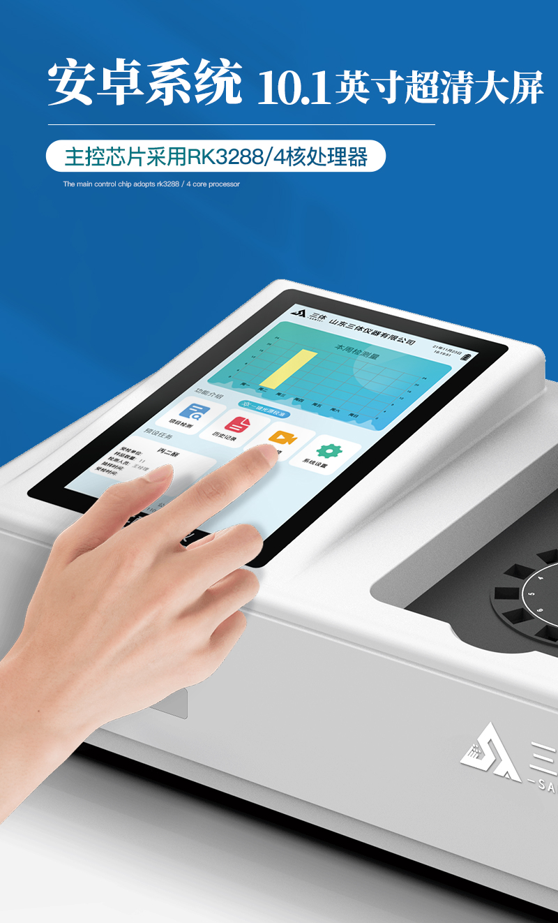 3、显示屏幕:仪器采用10.1英寸竖向液晶触摸屏显,搭配运行安卓智能操作系统,主控芯片采用ARM Cortex-A7,RK3288/4核处理器,主频1.88Ghz,操作方便,性能更强。
