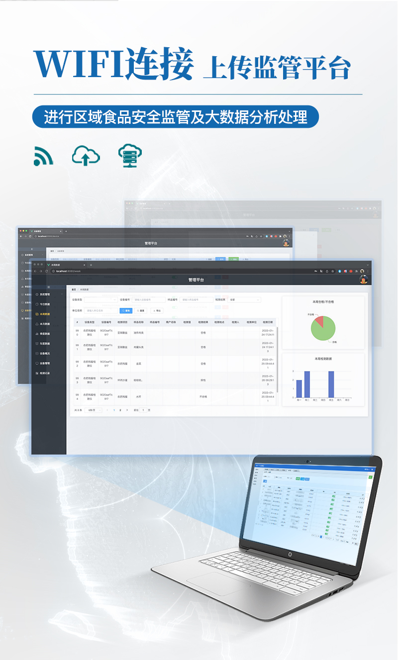 9.6、数据监管系统:同步对接监管平台,数据可局域网和互联网数据上传,检测结果可选择直接传至食品安全监管平台。进行区域食品安全监管及大数据分析处理与数据统计,检测区域食品安全长短期动态,达到食品安全问题预估、预警。