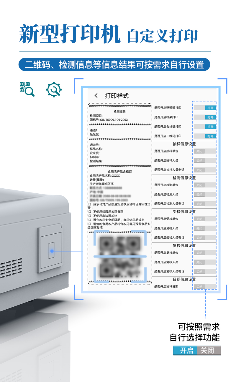 9.7.1、全新打印系统:内置全新打印机,新创自定义打印方式,可按需灵活勾选控制:二维码,抽样信息、检测信息,受检信息、复核信息、抽样日期、检测日期等信息的打印。