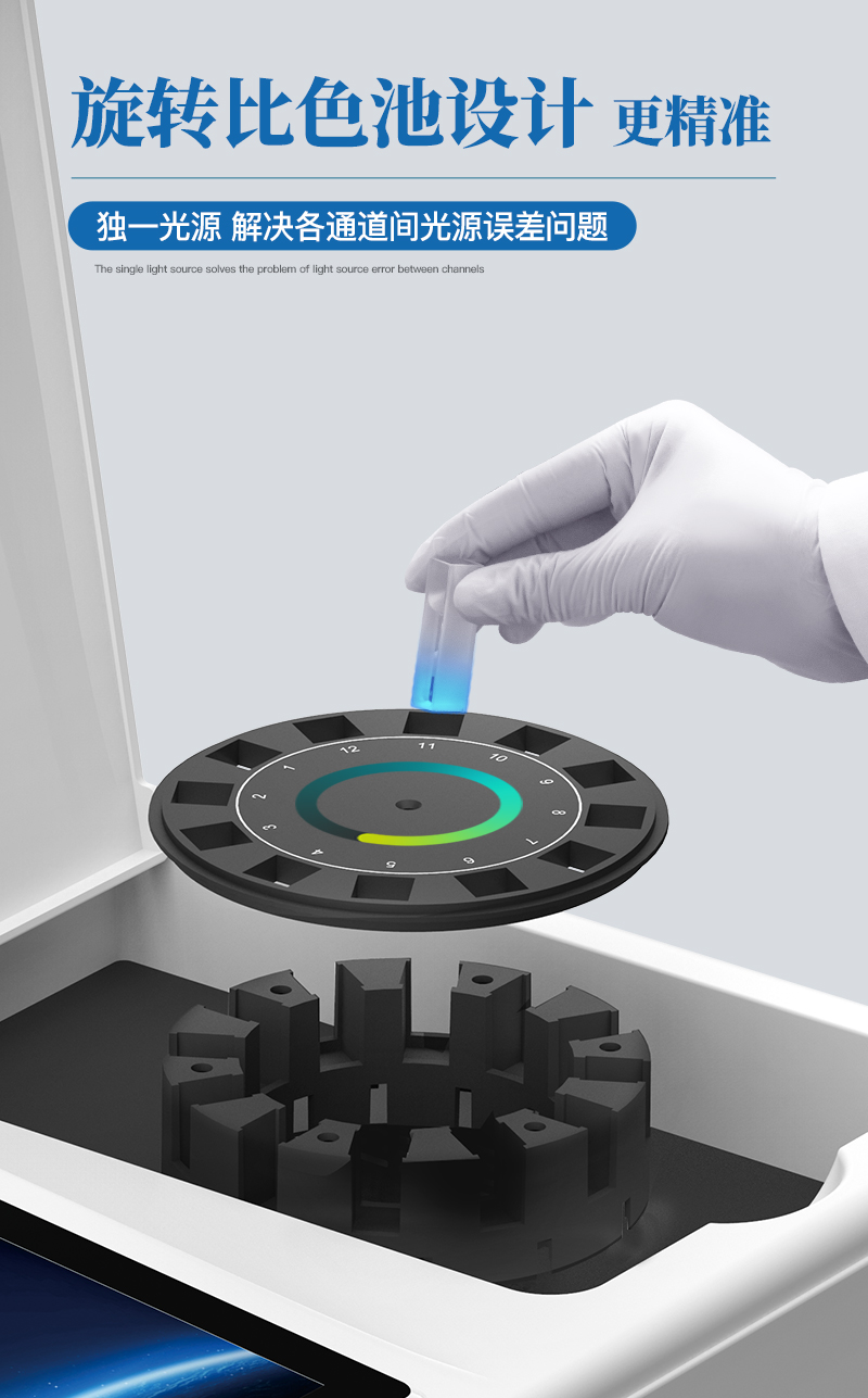 4、检测通道:≥12通道;采用精密旋转比色池设计,使用同芯片同光源校准精度,解决不同光源之间的误差值,更加准确高效。